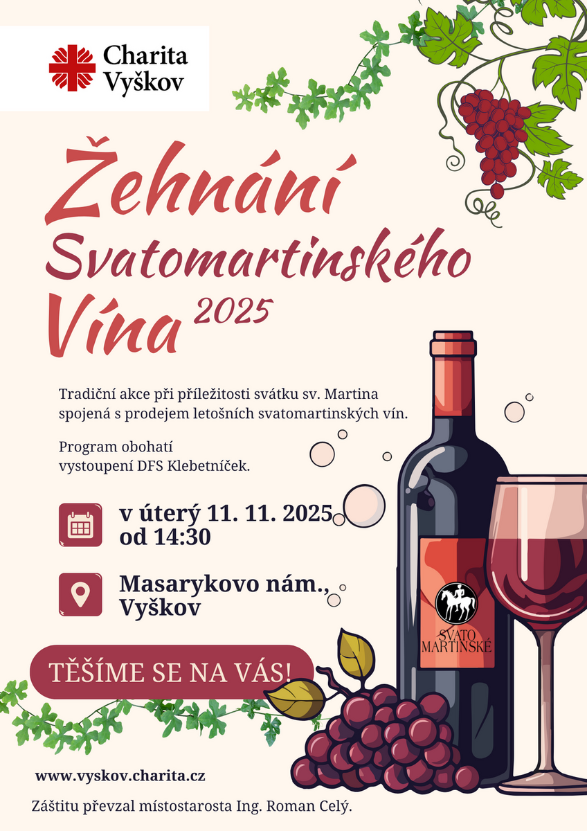 Jako každý rok, i letos pořádáme na svátek sv. Martina, v úterý 11.11.2025 od 14 hodin na Masarykově náměstí ve Vyškově slavnostní požehnání letoščních nových svatomartinských vín spojených s možnou ochutnávkou a prodejem. Program obohatí vystoupení DFS Klebetníček a přijede i svatý Martin na bílém koni.